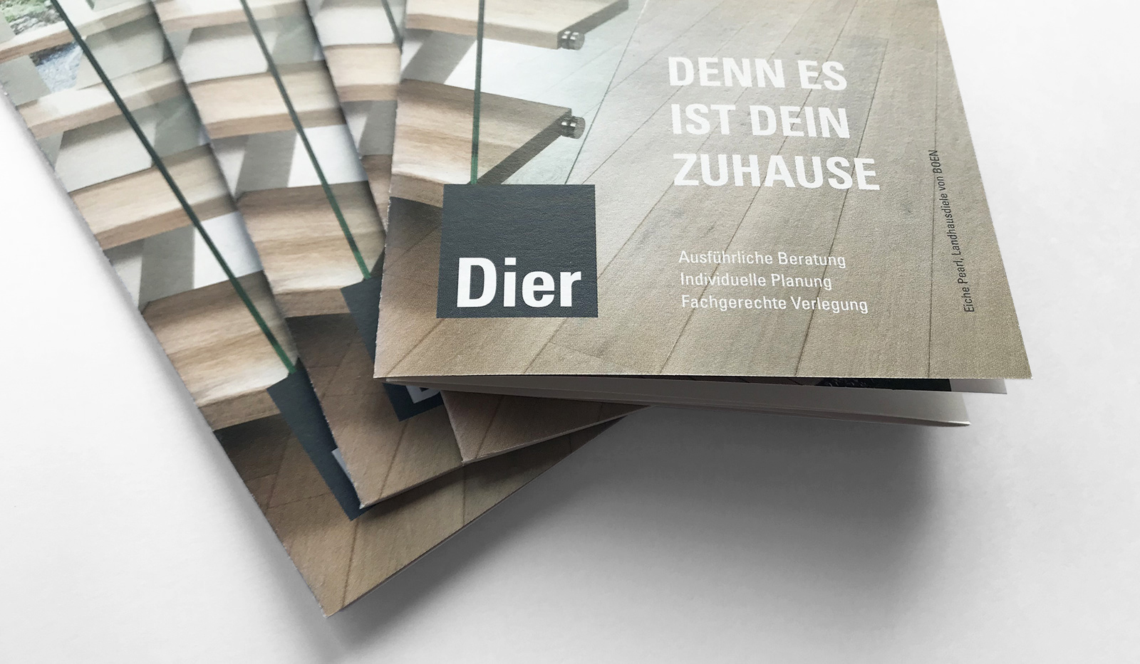Für das Trierer Traditionsunternehmen Fußboden Dier, den Spezialisten für Parkett und Designbeläge, gestaltete Goossens & Kopatz einen handlichen Folder, der das Portfolio des Unternehmens in Kurzform darstellt.
