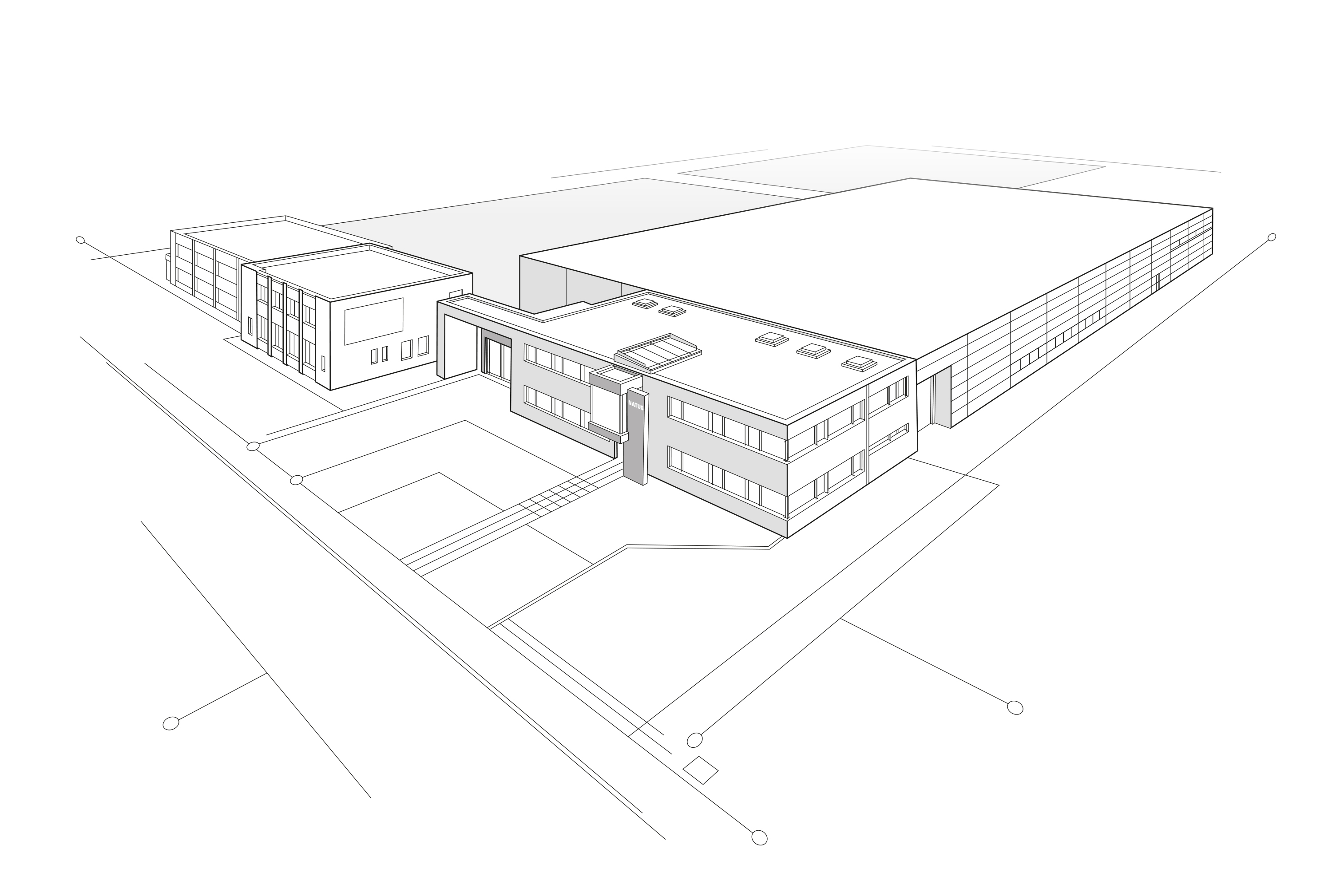 Goossens & Kopatz gestaltete im Rahmen einer mobilen Ausstellung (Roadshow) eine architektonische Vektorgrafik eines Ausschnitts des großen Betriebsgeländes in Trier-Nord (siehe oben). Links: Entwurfsskribble (Marker, Fineliner)