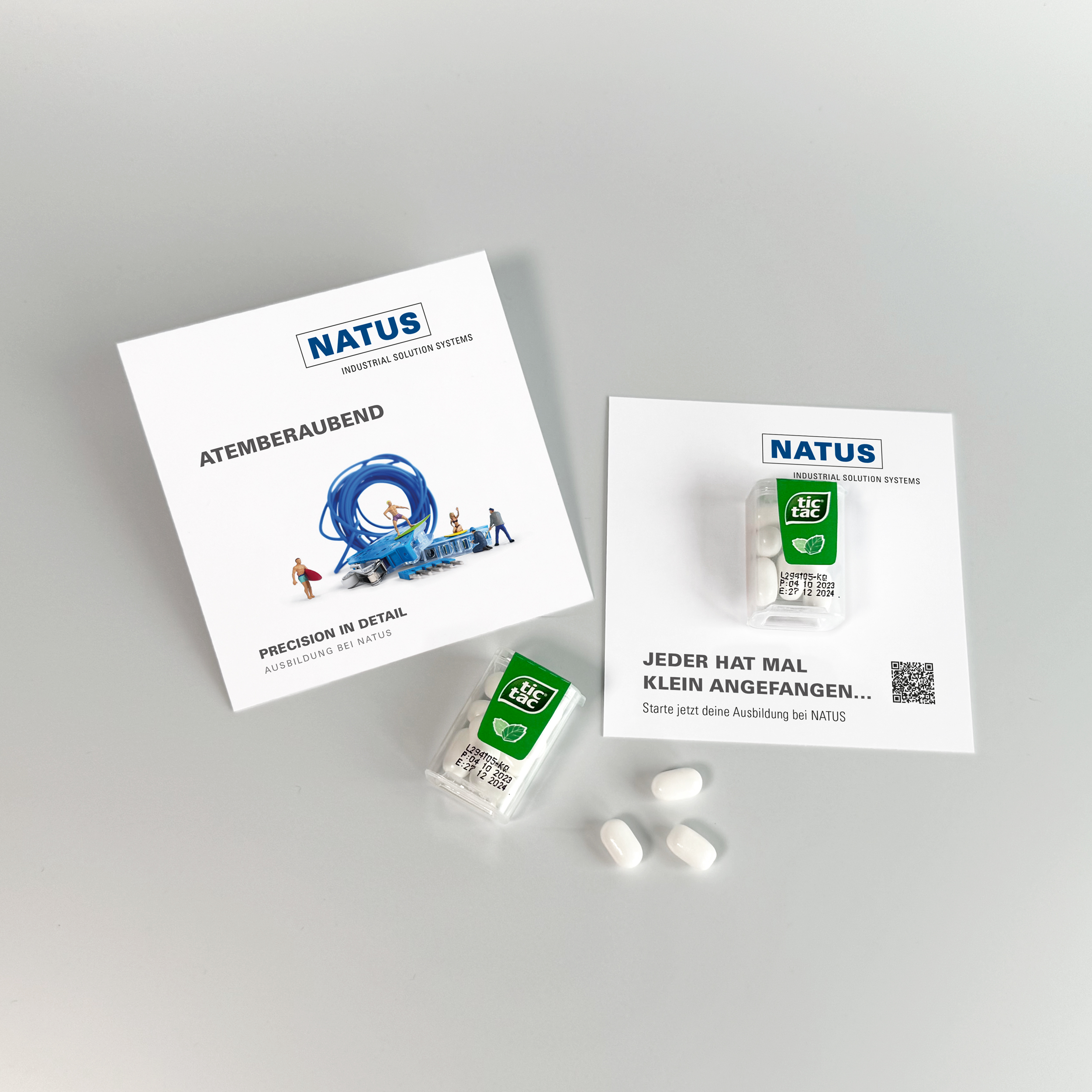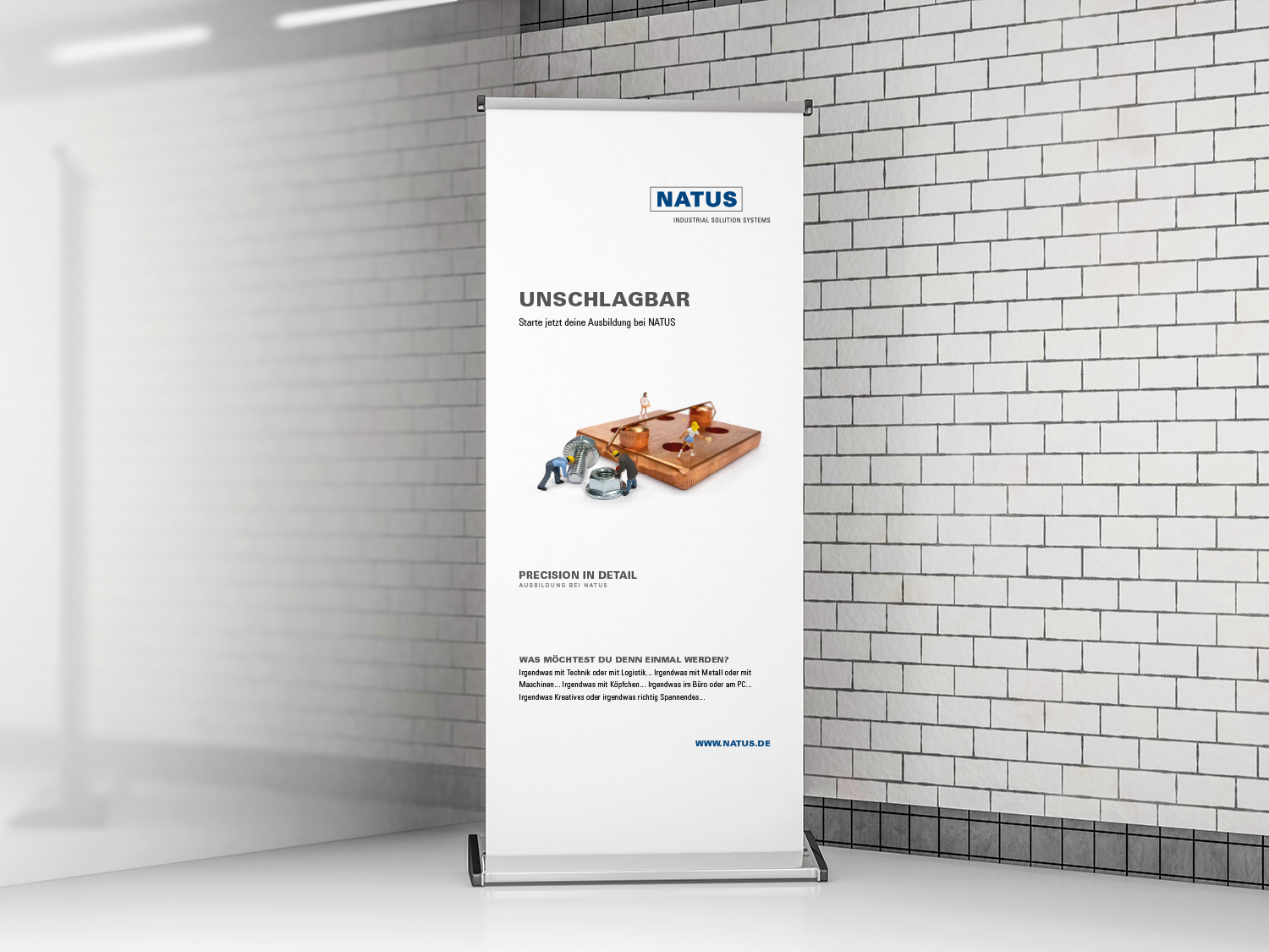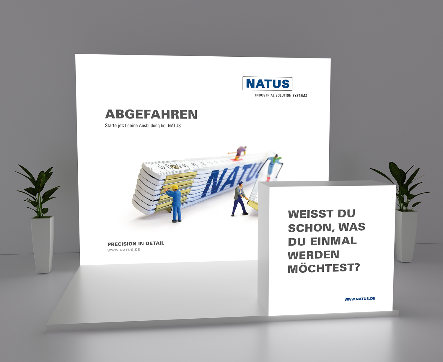 Das Thema "Ausbildung" wird bei NATUS groß geschrieben. Um die besten Talente zu gewinnen, wurde Goossens & Kopatz mit der Gestaltung und Umsetzung einer "Azubi-Kampagne" beauftragt. Die Azubi-Keyvisuals, in denen die Teenager sichtlich Spaß haben, orientieren sich an verschiedenen Sportarten wie Fußball, Tennis, Skifahren oder Surfen. Für die Teilnahme auf Ausbildungsmessen wurde ein Messestand, diverse Rollups, Flyer, eine Azubibroschüre und Give-aways mit kleinen, aufgeklebten TicTac-Boxen gestaltet und umgesetzt. Die Azubibroschüre kann auf der NATUS Webseite heruntergeladen werden.
