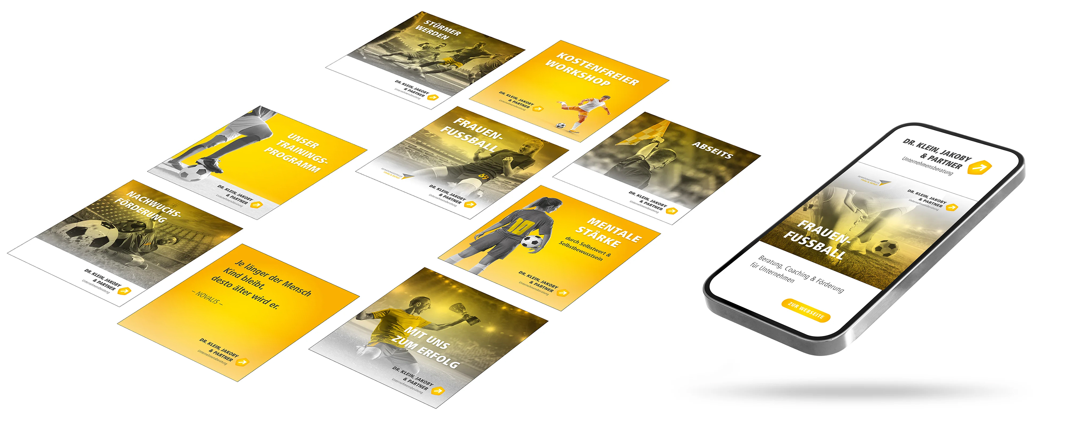 Die von Goossens & Kopatz gestaltete Fußballkampagne erhöht durch den kreativen Ansatz die Sichtbarkeit von Dr. Klein, Jakoby & Partner unter den sonst eher konservativ auftretenden Unternehmensberatern. Das Thema "Fußball" wird konsequent in alle Bereiche der Beratung übertragen. So wird aus Teambuilding die "Mannschaftsaufstellung", aus den Unternehmensschwierigkeiten das "Abseits" und aus Förderprogrammen die "Sportförderung".