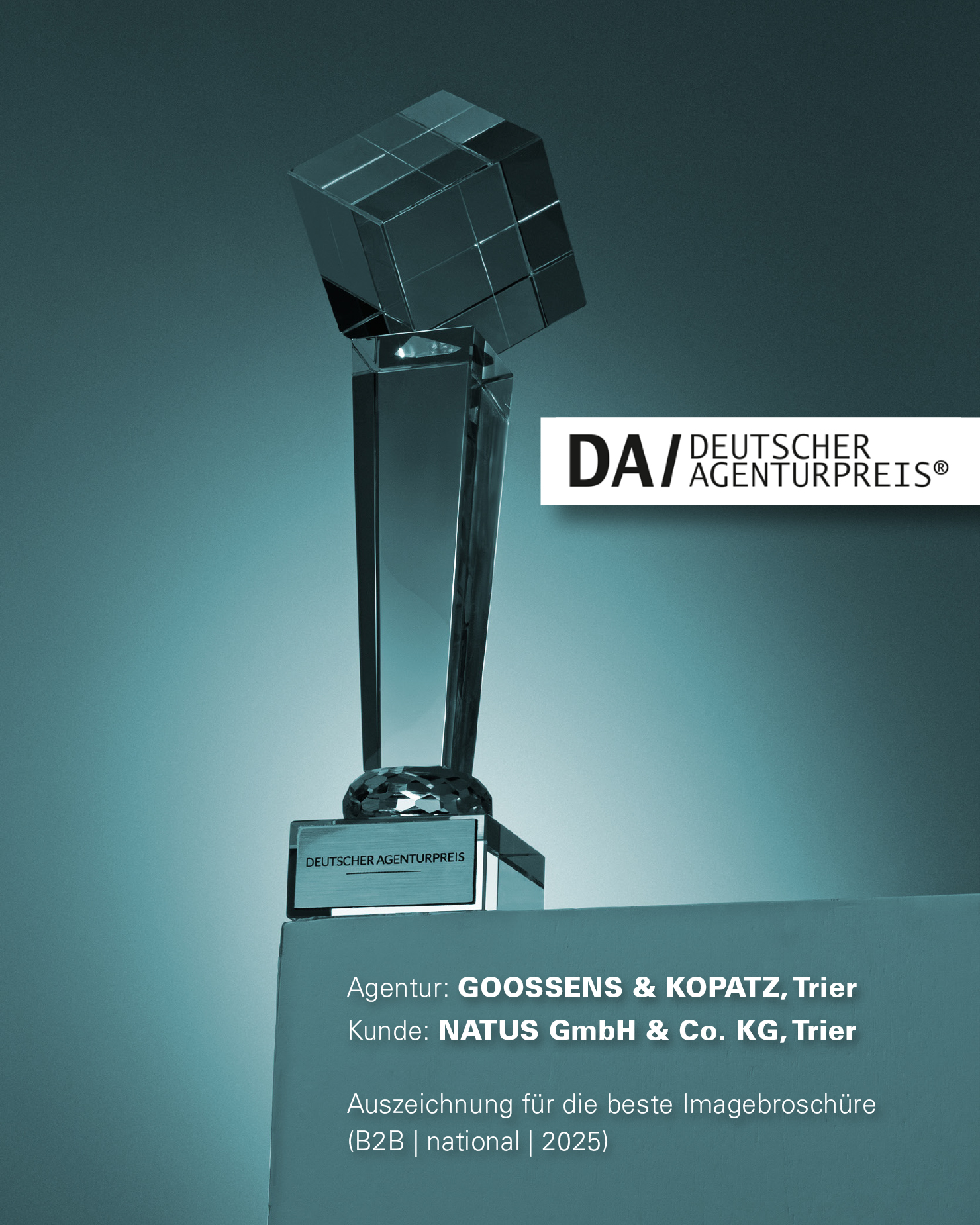 Die unabhängige Jury in Berlin schreibt hierzu: „Die Jury des Deutschen Agenturpreises zeichnet die Imagebroschüre der Agentur Goossens & Kopatz, Visuelle Kommunikation, Trier für NATUS GmbH & Co. KG, Trier aus, weil sie mit einem starken visuellen Konzept, authentischen Keyvisuals und einer klaren, modernen Gestaltung überzeugt. Sie vermittelt die Werte und Kompetenz des Unternehmens auf ansprechende und glaubwürdige Weise und setzte sich damit deutlich von den anderen Einreichungen ab.“