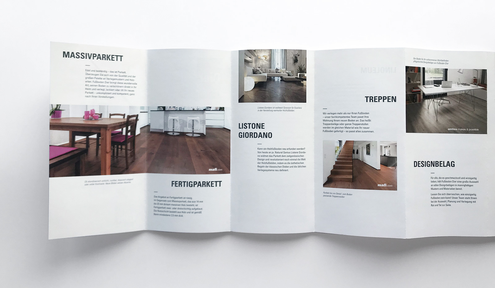 Für das Trierer Traditionsunternehmen Fußboden Dier, den Spezialisten für Parkett und Designbeläge, gestaltete Goossens & Kopatz einen handlichen Folder, der das Portfolio des Unternehmens in Kurzform darstellt.